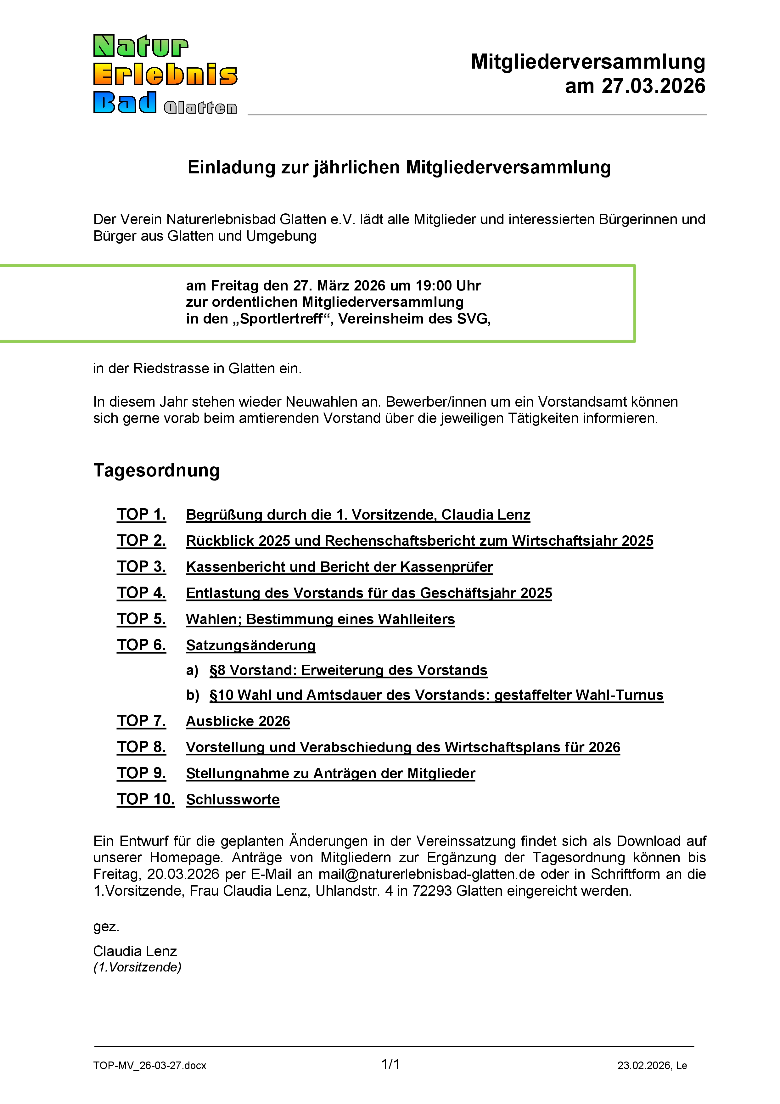 Änderungen der Adresse, Kontodaten, Nachweise für ermäßigte Mitgliedsbeiträge 2026 (Schülerausweis, Studienbescheinigung usw.) oder Mitglieder in der Familienmitgliedschaft (bitte auch Neugeborene anmelden) können gerne per E-Mail an